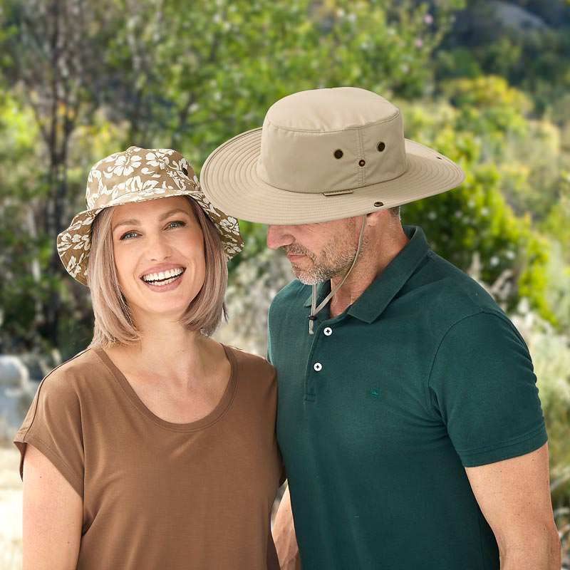 Chapeau 4 fonctions spécial plein air et loisirs, avec large bord de 7,5 cm et rangement secret pour argent et cartes à puce à l'intérieur, en toile polyester enroulable, lavable en machine à 30°.